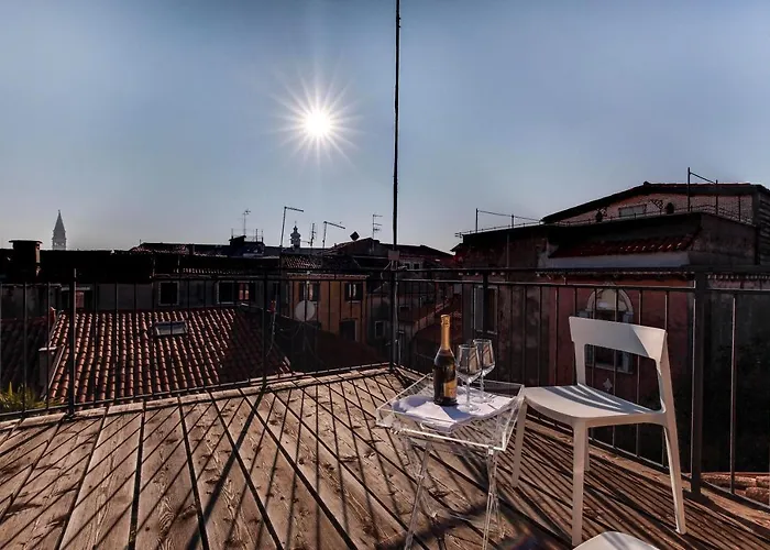 Das 1-Zimmer-Venice Skyline View Studio Apartment M0270428215 mit einer Fläche von 50 m² liegt im Zentrum von Venedig. Auf einer Terrasse dieses Apartments können die Gäste entspannen und einen Ausblick auf den Garten genießen.